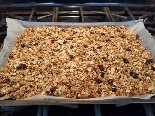Single layer on a sheet of parchment paper and bake at 275 degrees for 30 minutes, stirring half-way through.